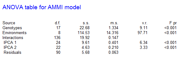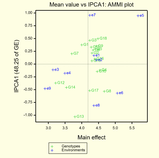 双标图目前主要有AMMI(主效可加互作可乘)和GGE双标图,主要用来评价一年多点或多点多点品种的稳定性和适应性。