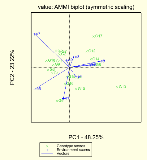 这里,由于AMMI模型剖分的是GbyE,因此双标图中仅仅显示基因与环境互作的结果。