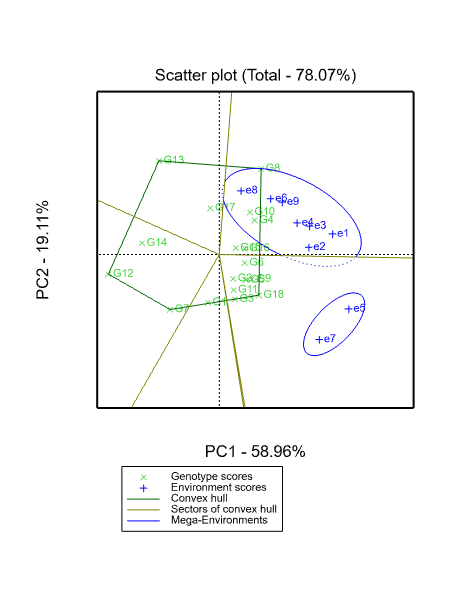 • 这张图可以得出:位于五边形顶角的品种是扇区内个环境下产量最高的品种,比如G18在环境E5和E7产量最高,品种G8在另外7个试验点产量最高。