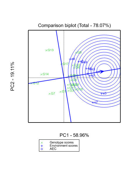 • 高产稳产功能图也需要环境平均轴(带箭头的直线),和平均环境值(直线上圆圈表示)。对其进行画圆圈,地点所在的圆圈越小,说明地点整体水平越好。