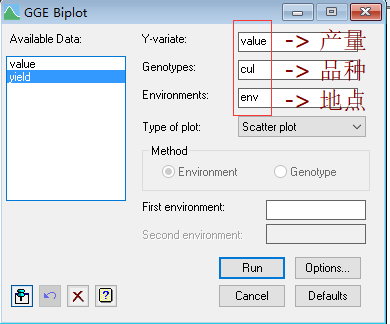 在模型中选择GGE Biplot对话框,在Y-variate中导入产量数据,在Genotype中导入品种数据,在Environments中导入地点数据。点击Run,运行模型。