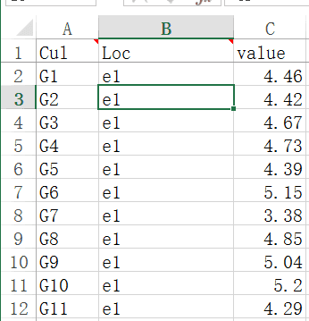 现有18个品种(G1 ~ G9),9个地点(e1 ~ e9),观测值为每个品种在每个地点的BLUP值(或者平均值)。