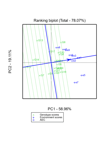 • 试验点线段和平均环境轴的角度是其对目标环境的代表性的度量,角度越小,代表性越强。如果一个试验点和平均环境轴夹角为钝角,则它不适合作为试验点。